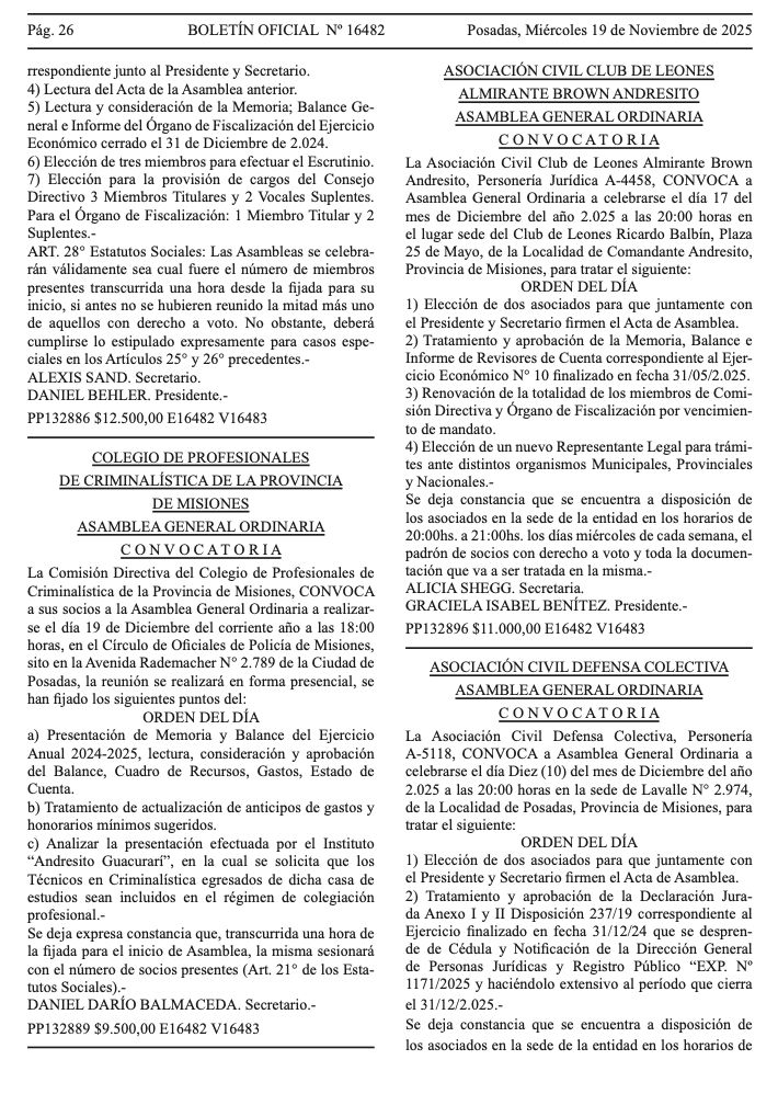 La Comisión Directiva del Colegio de Profesionales en Ciencias Criminalísticas de la Provincia de Misiones ha emitido la Convocatoria Oficial a la Asamblea General Ordinaria, un momento central en la vida institucional del Colegio y una oportunidad clave para que cada matriculado ejerza su derecho y deber profesional. La Asamblea tendrá lugar el 19 de diciembre, a las 18:00 horas, en el Círculo de Oficiales de Policía de Misiones, ubicado en Avenida Rademacher N° 2789, Posadas, en modalidad presencial, conforme a lo establecido en los Estatutos Sociales.